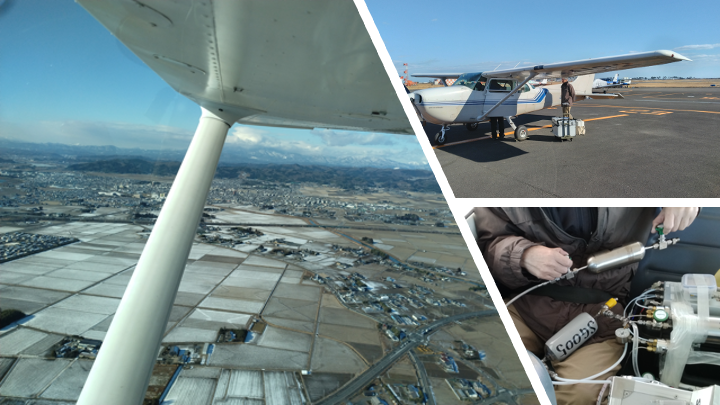 本研究室で40年以上にわたって続いているセスナ観測を紹介します。小型飛行機(セスナ機)で高度3.5 km程度まで上昇し、上空の大気を試料容器に採取して実験室に持ち帰り、温室効果気体の濃度や同位体比を分析します。今日は午前中は快晴で、頂上部に雲のかかった蔵王がきれいに見えました。